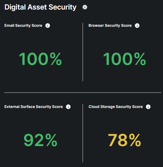 Digital Asset Security provides real-time assessment of the security status of different digital asset categories including Email, Browser, Externak Attack Surface and Cloud Storage.