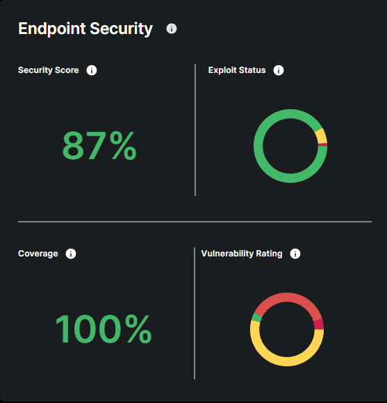 Provides an overview of your company's current level of endpoint protection (overall security score, number of attacks remediated, coverage and detected vulnerabilities including exploit status and severity)