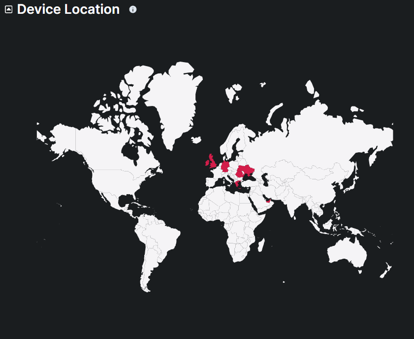 This map displays the geographical distribution of users in the organization accessing the digital assets, highlighting the countries with active users in the last 24 hours. Monitoring the locations of device access helps in identifying abnormal locations and ensuring compliance with regional security policies.