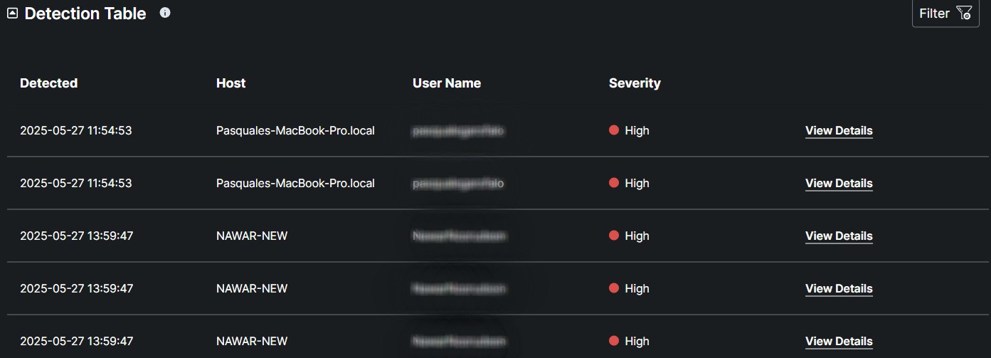 The Detection Table provides detailed information about each detected event, including the Host Name, which identifies the affected device; the Username, which indicates the user associated with the event; and the Severity, which classifies the threat's potential impact. Each record also includes a View Details button, allowing for deeper analysis and further action as needed.