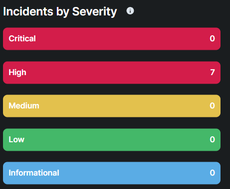 Critical: These incidents represent the most severe threats. They indicate active breaches, such as confirmed malware infections, exploitation of vulnerabilities, or unauthorized access that has the potential to cause significant damage to systems or data. Immediate response is required to contain and remediate the threat.