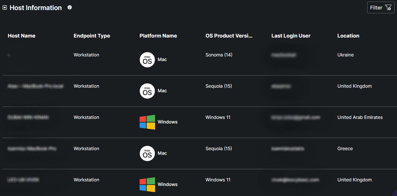 The Host Information table contains essential details about each monitored device, including the host name, product type, platform type, OS product version, last login user, and location, offering a comprehensive view for effective tracking and management.