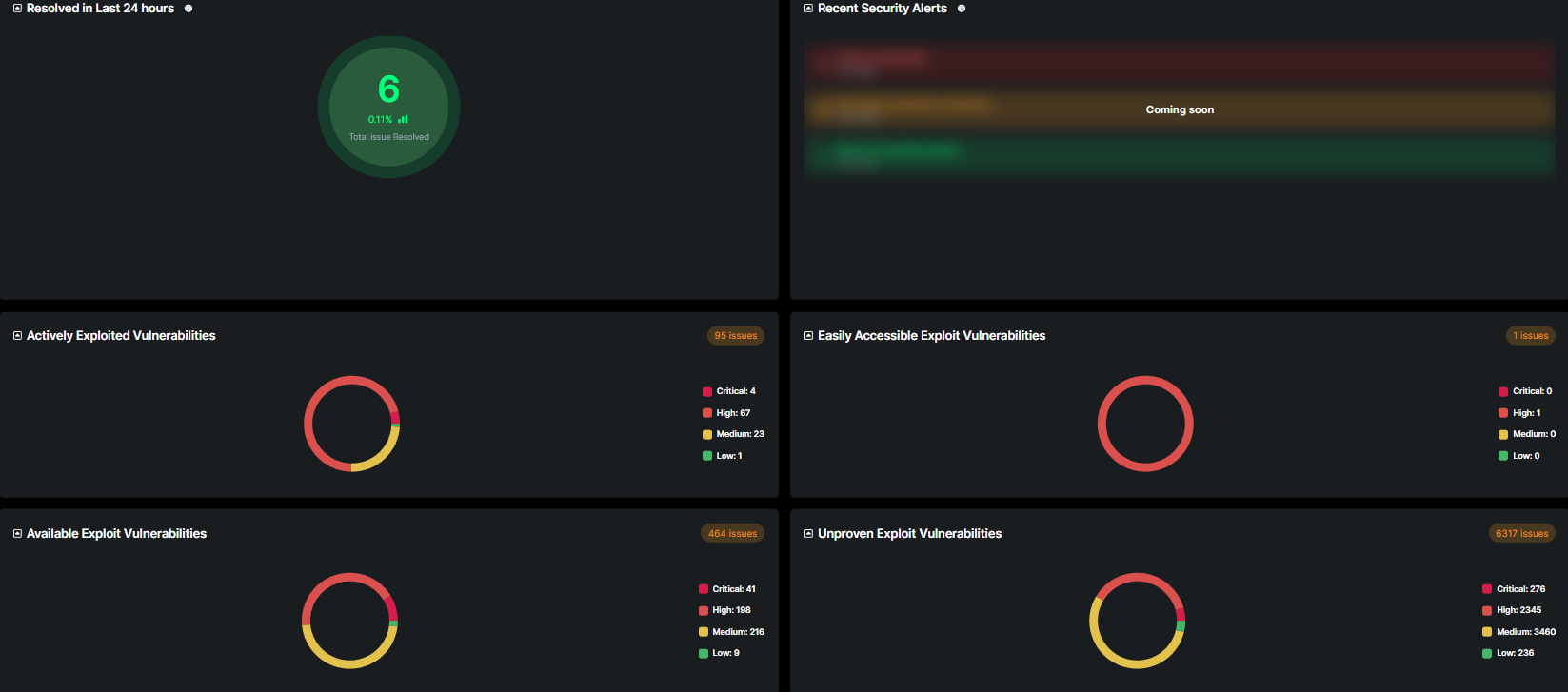 The Security Vulnerabilities Dashboard provides a consolidated view of the organization's current vulnerability and exploit landscape. It is designed to help security teams monitor, track, and respond to known threats efficiently by categorizing and visualizing relevant data points.