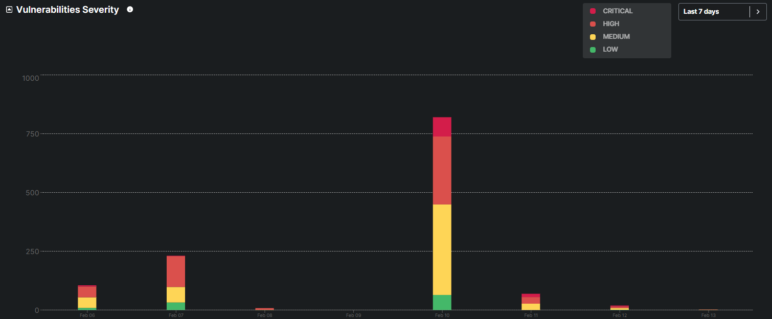 The graph displays the distribution of vulnerabilities classified as Critical, High, Medium, and Low over a specific period, helping prioritize remediation efforts based on the potential impact and urgency of each vulnerability.