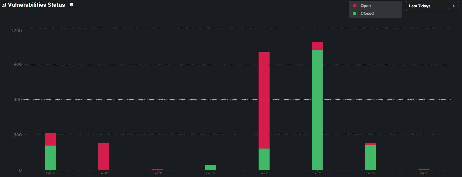 This graph categorizes vulnerabilities as Open or Closed, providing a clear view of remediation efforts and progress in addressing security issues and patches.
