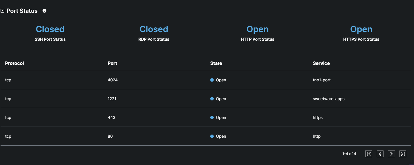 This table provides a detailed overview of the status of ports associated with the website's external surface, including whether they are open, closed.