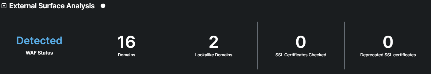This section provides a comprehensive analysis of the website's external attack surface, including Web Application Firewall status, company domains, lookalike domains and status of SSL Certificates.
