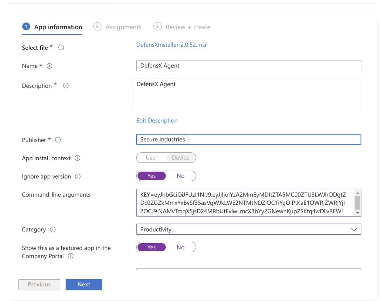 DefensX Agent installer is a regular MSI package that you can deploy through Intune and can be customized by environment variables like deployment key or some additional settings.