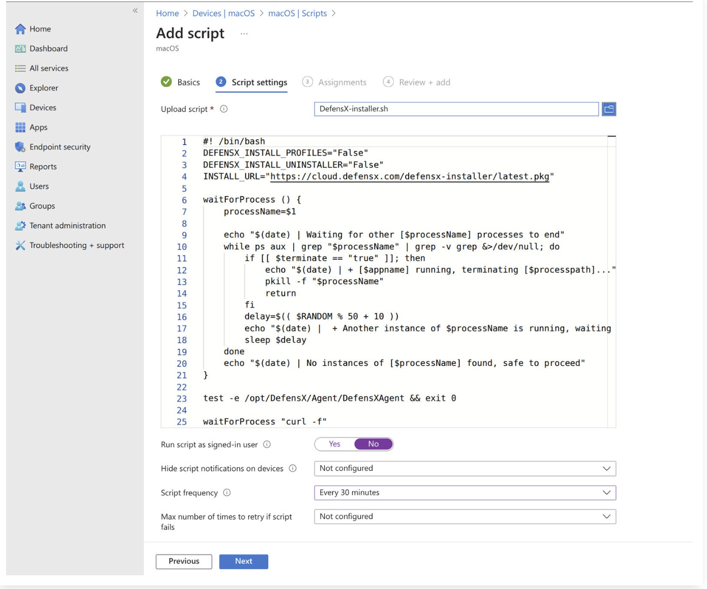 Enter DefensX Installer as the script name, then click Next