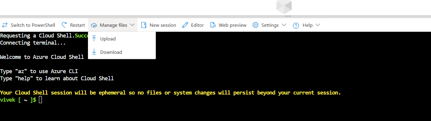 In the Cloud Shell, click on the Manage files dropdown button on the nav bar of the cloud shell window.